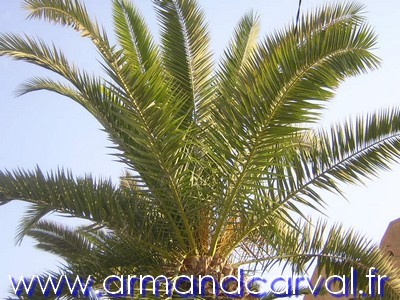 Les photos de ces palmiers ne sont pas prises dans la palmeraie mais carrément au coeur de la ville de Marrakech où les arbres affichent parfois de plus belles couleurs qu'au centre mythique de la palmeraie. Sur la photo 1, il est aisé de voir que le palmier déploie ses ailes vers le ciel complètement azur. Tout près (photo 2) un autre palmier montre les grappes de dattes qui n'attendent que le temps et le soleil pour mûrir. En s'approchant plus près encore (photo 3) on voit les fruits en pleine gestation avant d'être susceptibles de subir la cueillette. Ces photos contrastent avec celles prises dans la palmeraie où leur aspect, à certains endroits, montrent des signes de désolation. C'est l'usure du temps ou la fatigue des arbres, la maladie et la pollution qui leur donnent cet air dénudé et triste. Il suffit de passer lentement sur la petite route de la palmeraie pour vivre ces décors. Ces palmiers montrent que Marrakech sans palmiers serait une ville sans âme. Depuis ces dernières années plus de 500 000 palmiers ont été plantés. Il faudra attendre qu'ils grandissent avec le temps. C'est déjà un bon signe pour l'avenir de ces arbres. | ||||
