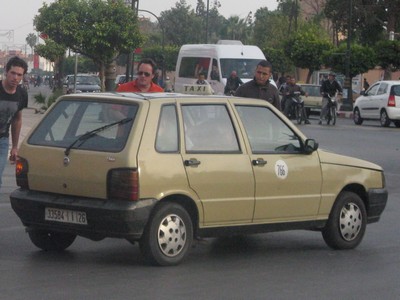 régions et les villes : A Marrakech la couleur des grands taxis est la même que pour les petits. Ce n'est pas le cas dans toutes les autres villes. En général ils sont blancs ou gris. Les grands taxis sont souvent des Mercédès qui ont un kilométrage avancé compte tenu du fait qu'ils sont toujours sur les routes. Les petits taxis sont souvent des Peugeot 205, Fiat Uno, Fiat Palio, Dacia Logan et Dacia Sandero. | ||||