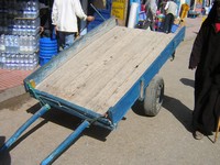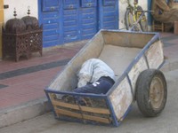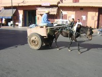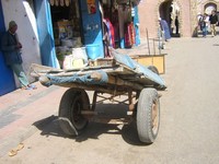 Les carioles font parties du paysage dans les rues de Marrakech, d'Essaouira et du Maroc. Elles sont indispensables pour véhiculer des marchandises dans les souks où il n'est pas possible à une voiture d'y aller. Les carioles sont tirées par des hommes car même l'attelage avec le cheval n'est pas en mesure d'entrer dans ces ruelles étroites. Les souks sont ouverts de 8h30 à 20h00. Pour éviter d'être pris dans la cohue des visteurs ce qui peut être fait avant est effectué entre ces heures-là. Cela n'empêche pas de les voir circuler dans les souks pendant la journée car il faut bien livrer et retirer des souks les marchandises vendues. Plus de 2 500 artisans et commerçants sont présents dans cette médina. Certains donnent directement sur la place ce qui facilite le transport des marchandises. Les carioles sont chargées à bloc pour éviter de faire trop de tours. Parfois le poids est tel que les personnes ont du mal à les tirer. Dans les rues elles circulent par le flot des voitures, des vélos, des vélomoteurs, des calèches, des cars. Dans la journée certains attendent de faire une course un peu comme les taxis. Lorsqu'il fait trop chaud elles servent aussi pour faire la sieste. | ||||