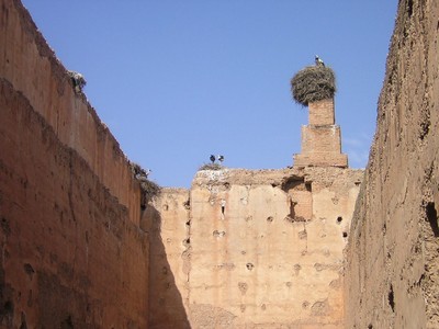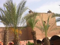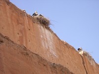 Les cigognes ont décidé d'élire domicile sur les murs des vestiges du Palais El Badii. Elles font partie du décor. Il est possible de les apercevoir du Mellah, place des ferblantiers. Il suffit d''entrer au Palais pour les voir de plus près ou près de ses abords. Leurs nids faits de branchanges font parfois 1 mètre de hauteur. Le claquement de becs des cignognes rompt le silence dans ce vaste décor des ruines de ce palais qui abrita, jadis, 360 chambres. Les cigognes sont présentes sur d'autres bâtiments où elles construisent leur nid. La cigogne venant d'Europe vient passer l'hiver dans les pays chauds. Marrakech n'est qu'une étape de leur voyage vers la Mauritanie, le Mali, le Ghana ou le Sénégal mais depuis quelque temps, elles restent à Marrakech, dimivuant ainsi leur migration. Cela pourrait avoir comme conséquence une diminution de leur nombre. La cigogne, qui peut atteindre 2 mètres, déploie ses ailes pour des longues distances dans les airs en parcourant chaque jour entre 150 et 250 kms pour un périple de 5 000 kilomètres lors de leur migration d'automne suivie de celle du printemps. Le soleil et la chaleur du Maroc font que quelques unes y restent bien plus longtemps. Une cigogne a une durée de vie d'environ 30 ans. | ||||