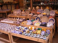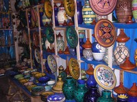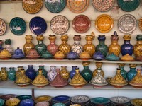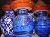 A Marrakech on trouve de la faience partout dans les boutiques. Elle provient de Fès ou de Meknès. Les poteries peintes ou la céramique émaillée se trouvent dans des récipients adaptés à un usage précis : plat conique, pichet, pot à eau, jarre plats divers, tajine qui ont un nom spécifique pour chacun d'entre eux. Les touristes sont sollicités dans les nombreuses boutiques et beaucoup de résisteront pas en achetant quelques faiences pour agrémenter leurs souvenirs de leur voyage au Maroc. En acheter est une chose, les rapporter est une autre car les bagages ne sont extensibles. Mettre de telles faiences dans les soutes des avions sachant que les bagages sont entassés les uns sur les autres dans les aéroports comportent quelques risques. il faut peut-être choisir un autre moyen de transport. L'étalage de ces faiences, céramiques et porcelaine est très attrayant pour les touristes. Ces objets sont des créations artistiques avec des couleurs recherchées pour les mettre en valeur. Toutes ces couleurs montrent la richesse de ces objets en leur donnant une valeur certaine. | ||||