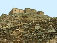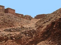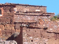 Les photos de cette page sont prises au même endroit dans un village berbère sur la route d'Asni en venant de Marrakech et de Tahanaoute. Ces maisons sont situées en bas du plateau du kik. Il est possible de voir qu'elles sont contruites en pierre sur un sol rocailloux. Dans l'entourage de ce village on voit des chèvres, des ânes et quelques habitants et une école où il y a très peu d'élèves. Pour augmenter un peu leurs revenus les voyagistes font arrêter les touristes pour prendre un thé à la menthe lorsque les excursions ont lieu au plateau du kik. Les voyagites font tourner les maisons qui acceptent de recevoir. Le nombre d'excursions sur la plateau du kik est important ce qui permet aux habitants de cette région se trouvant sur le circuit de bénéficier de ces rencontres. Les habitants de ces maisons vivent de peu. Lors du passage pour prendre et voir la confection du thé à la menthe, les habitants berbères font visiter leur maison. Après le thé à la menthe et la visite des lieux, les touristes quittent ce lieu. En général un pourboire est laissé à ceux qui reçoivent même si les voyagistes les rétribuent pour cette démonstration et le thé à la menthe offert. Cela leur permet d'avoir un petit complément de revenus. La poussière fait partie de leur quotidien parmi ces terrains arides et rocailleux perdus dans la montagne. | ||||